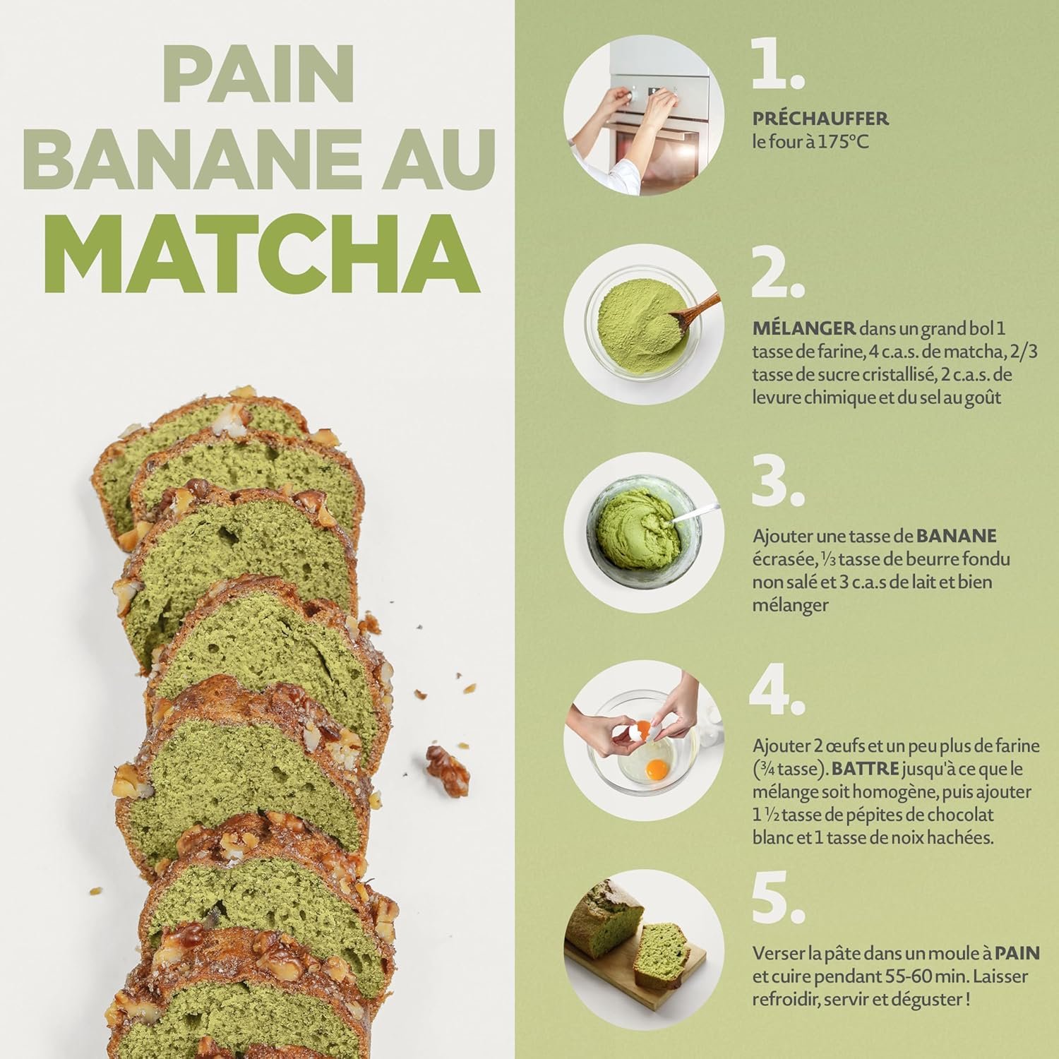 Ajoutez la poudre de thé matcha dans des smoothies, du lait ou des desserts cuits au four. Nous vous conseillons d’en utiliser au maximum 2 doses par jour (environ une cuillère à café pleine de thé). Il est également exceptionnel s’il est mélangé avec d’autres arômes comme la vanille, la cannelle et le chocolat blanc.