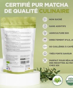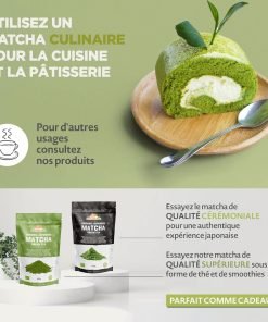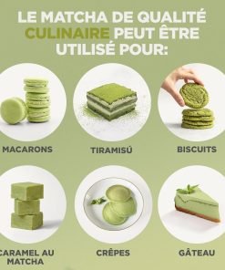 Notre matcha est de qualité culinaire, c’est-à-dire qu’il est idéal pour préparer des desserts et comme ingrédient dans des recettes de cuisine. Il est également disponible dans la version « cérémoniale » et « premium » comme thé à boire et mélangé seulement avec de l’eau.