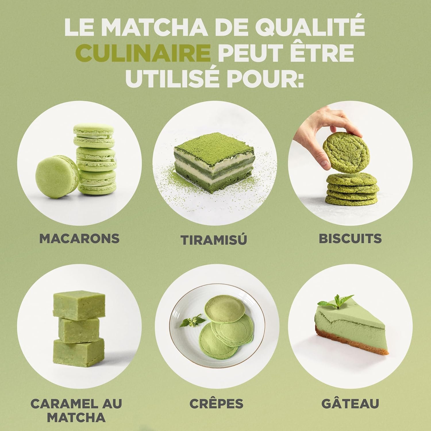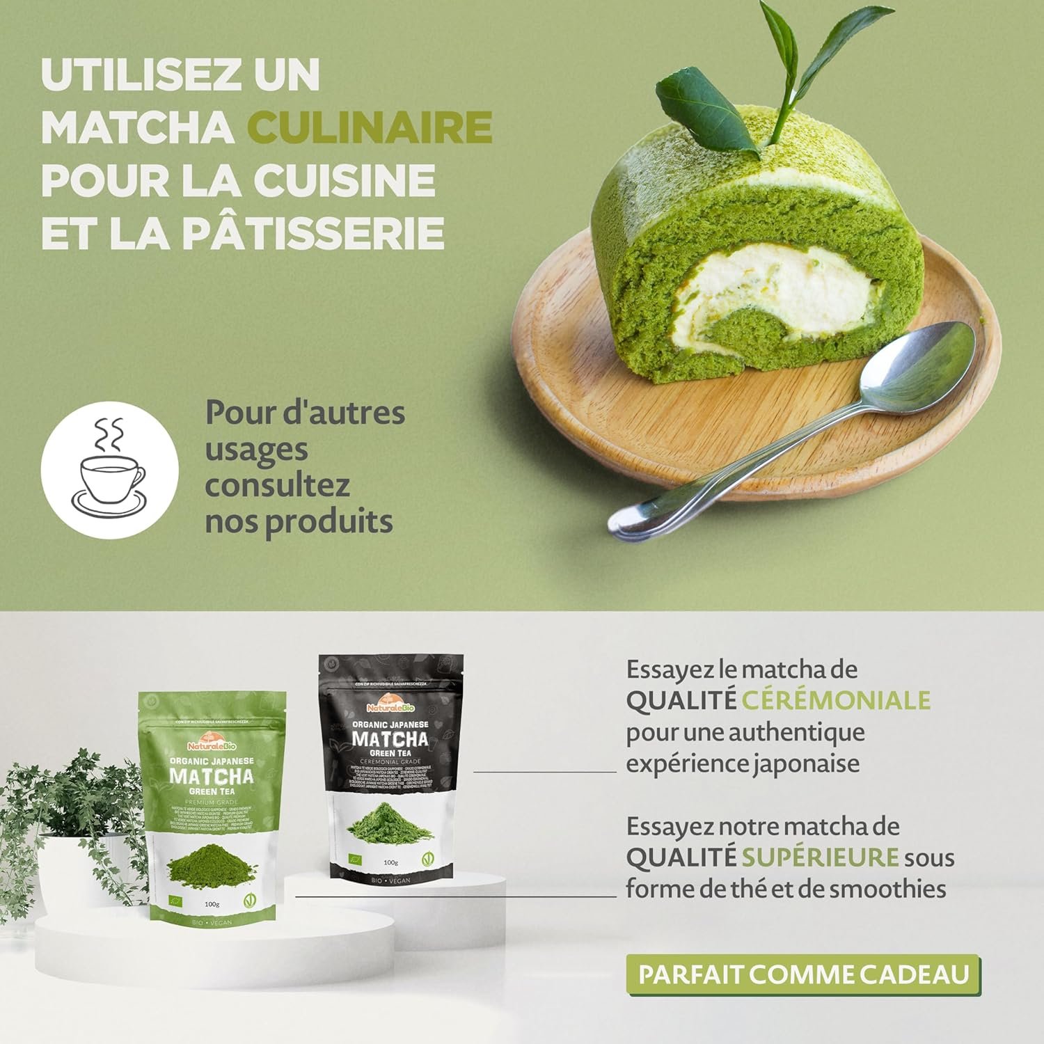 Le matcha Premium et le matcha Cérémonial conviennent lorsqu’ils sont utilisés comme thé à boire, dans des boissons et comme ingrédient de cuisine. Le matcha culinaire convient uniquement comme ingrédient de cuisine, dans des recettes ou ajouté dans le lait