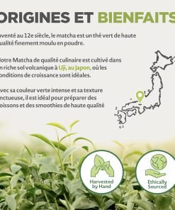 Poudre de thé vert Matcha traditionnel : Réputé pour son importance culturelle, ses propriétés bénéfiques pour la santé et, surtout, pour son goût, le thé japonais est très apprécié. Notre poudre de matcha est cultivée et produite dans la patrie du matcha : Uji, Kyoto.