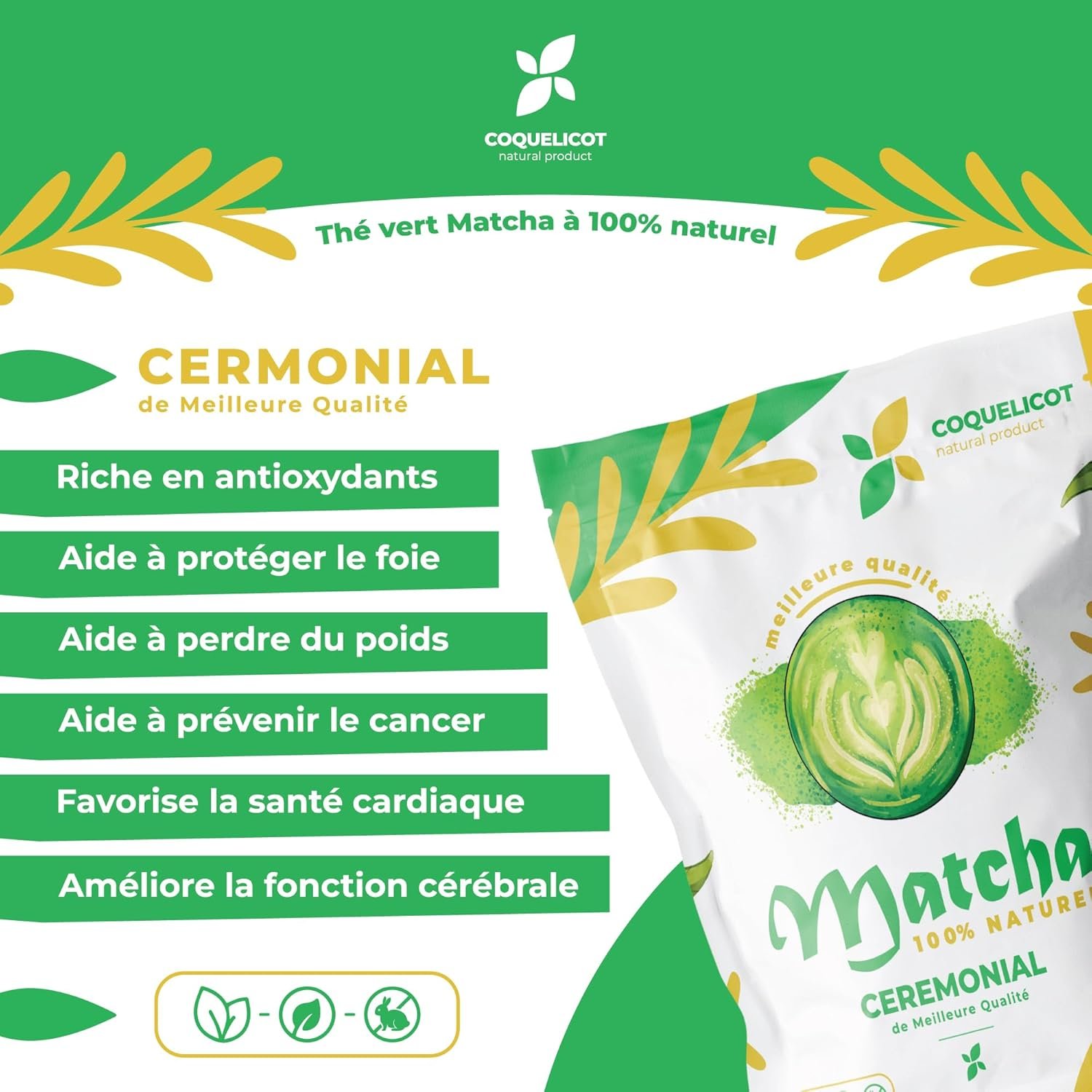 Découvrez le Thé Matcha japonais. Poudre 100% naturelle, meilleure qualité. Grade CEREMONIAL 50G + cuillère en bambou inclus